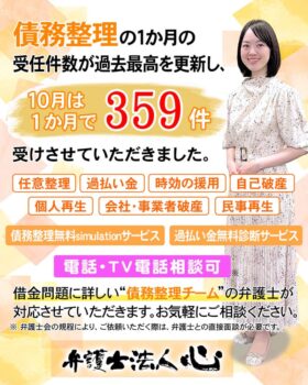 2025年9月に続き、10月も債務整理の1か月のご依頼件数が過去最高を更新し、『359件』を受けさせていただきました。